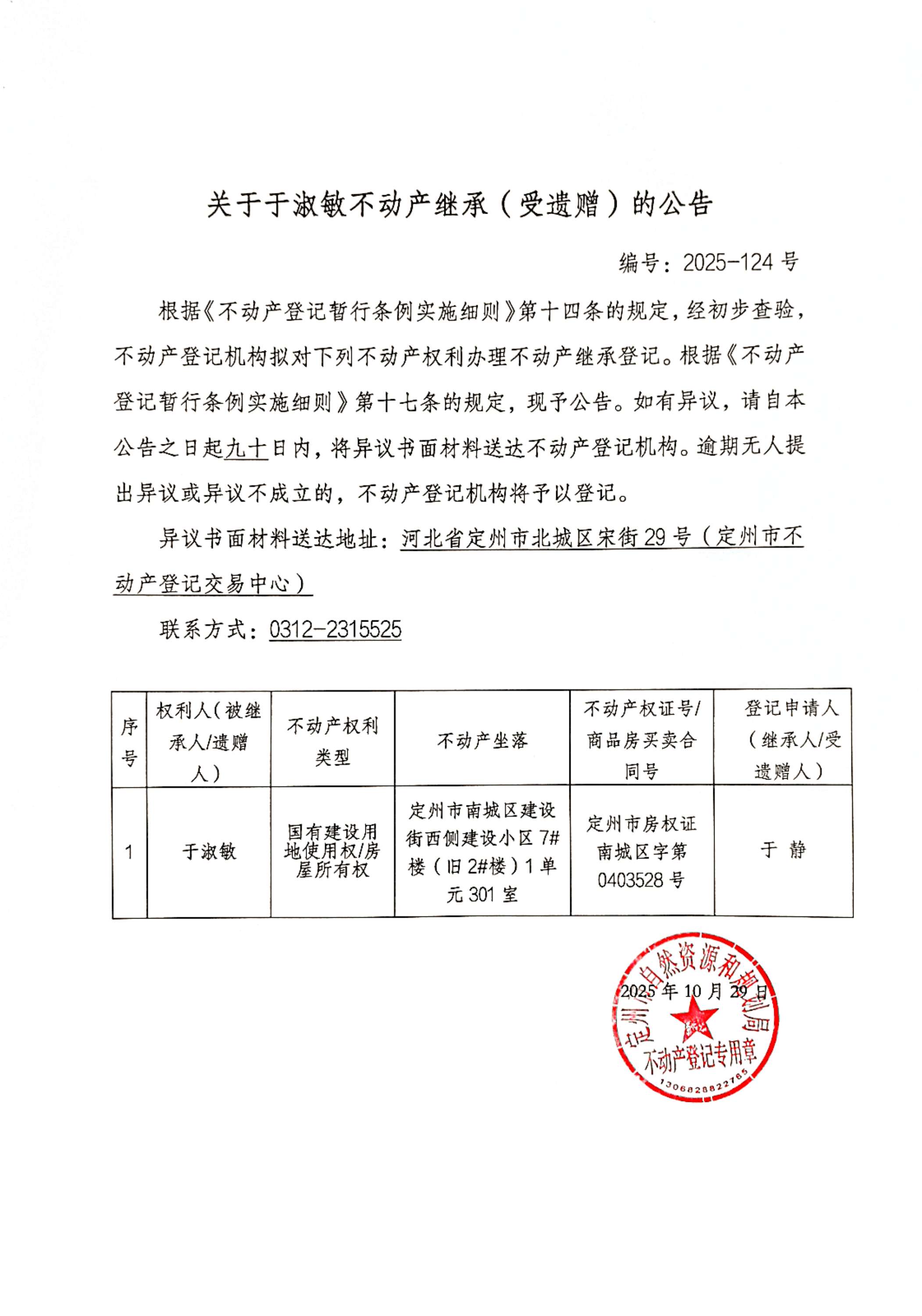 關(guān)于于淑敏不動(dòng)產(chǎn)繼承(受遺贈(zèng))的公告