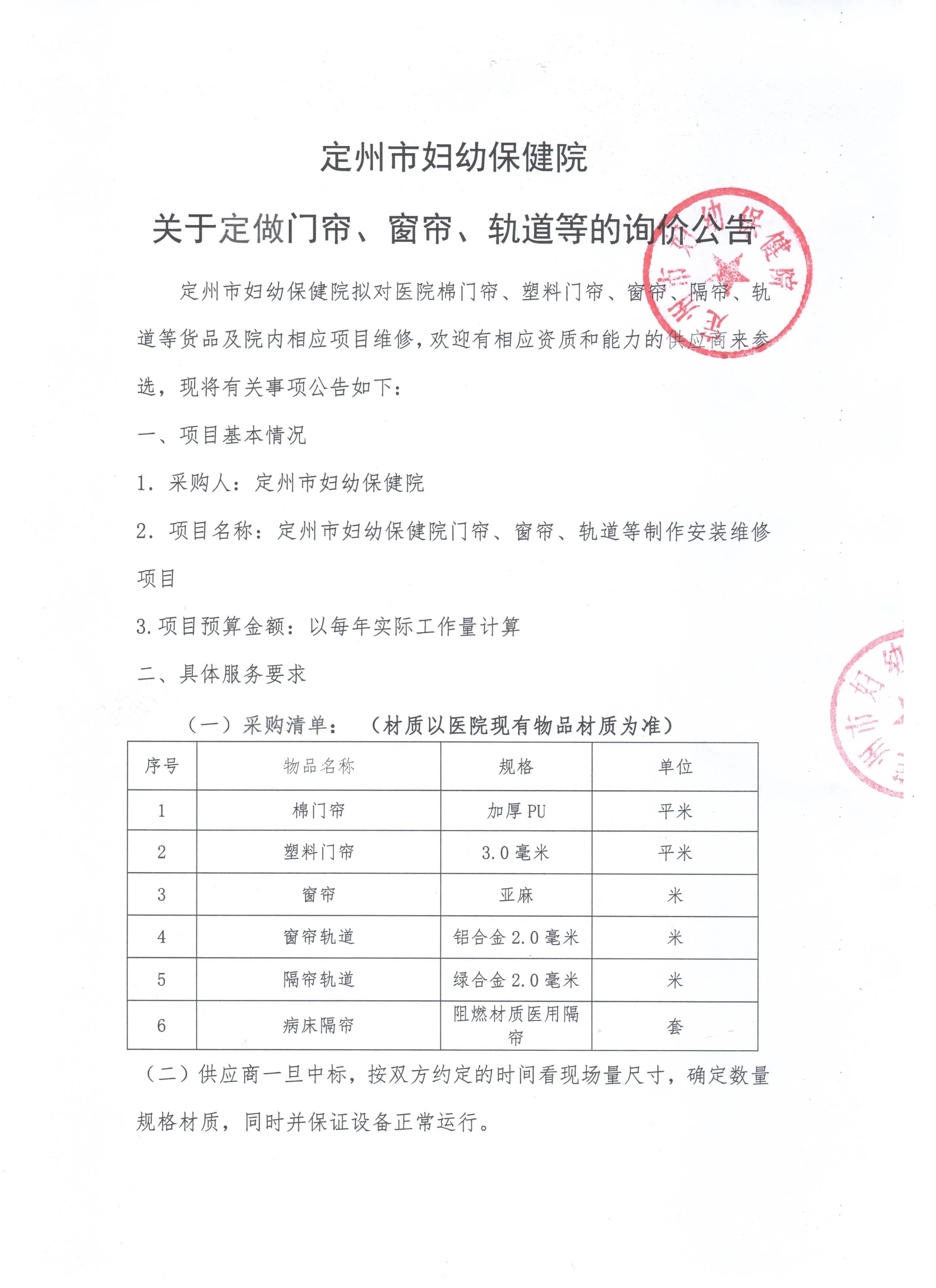 定州市婦幼保健院關于定做門簾、窗簾、軌道等的詢價通知