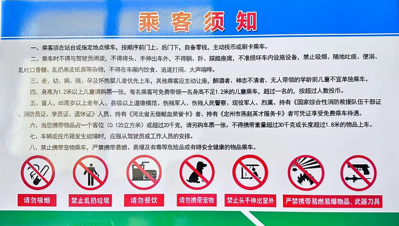 八、禁止攜帶寵物乘車,嚴(yán)禁攜帶易燃、易爆及有毒等危險(xiǎn)品或有礙安全健康的物品乘車。