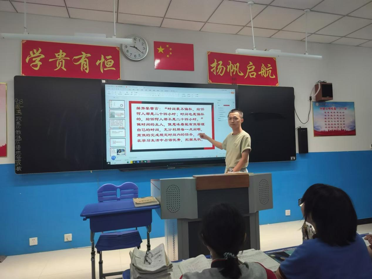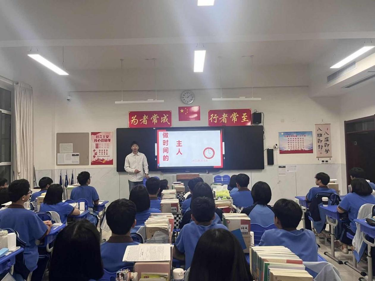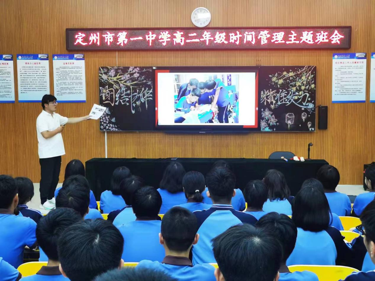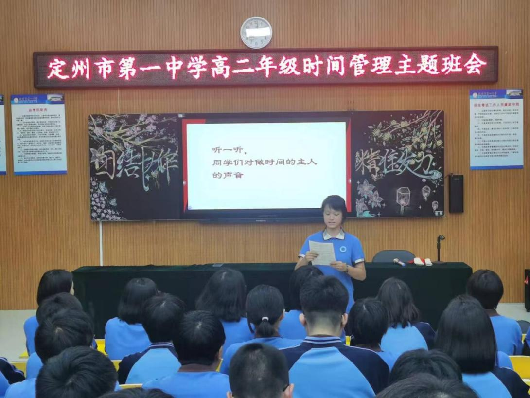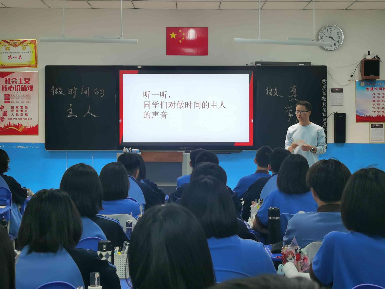 為引導(dǎo)學(xué)生珍惜時(shí)間,樹立良好的時(shí)間觀念。高二年級開展了以“做時(shí)間的主人”為主題的班會公開課活動,高二B4班在階梯教室進(jìn)行了班會展示。