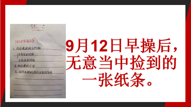 班會課上,B4班班主任李新振老師從不經(jīng)意間撿到的一張操前背誦的小紙條切入了今天的主題班會——做時(shí)間的主人。這也證明,榜樣就在你我身邊,日常生活中有不少同學(xué)正在爭分奪秒的利用零散的時(shí)間去記憶背誦。