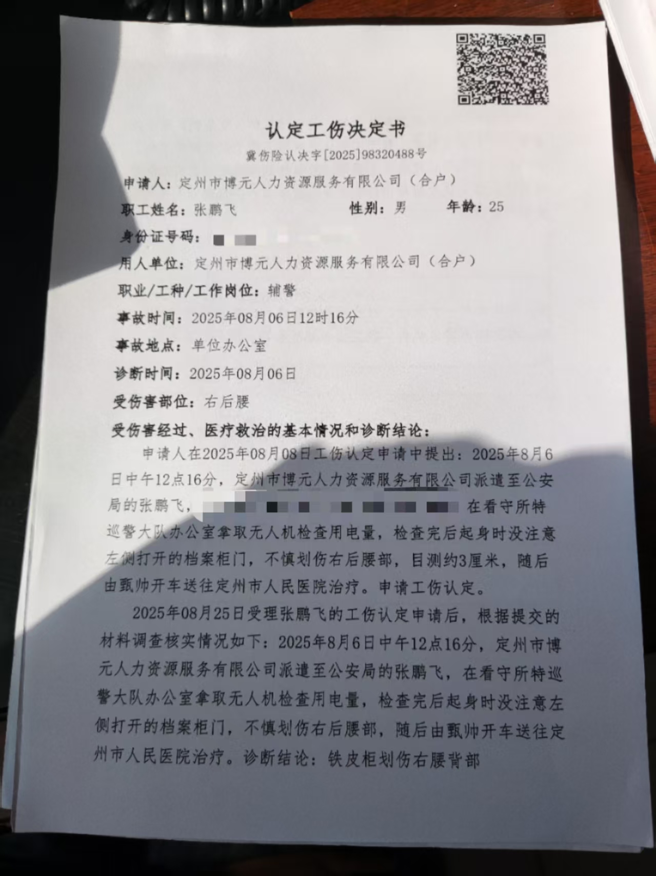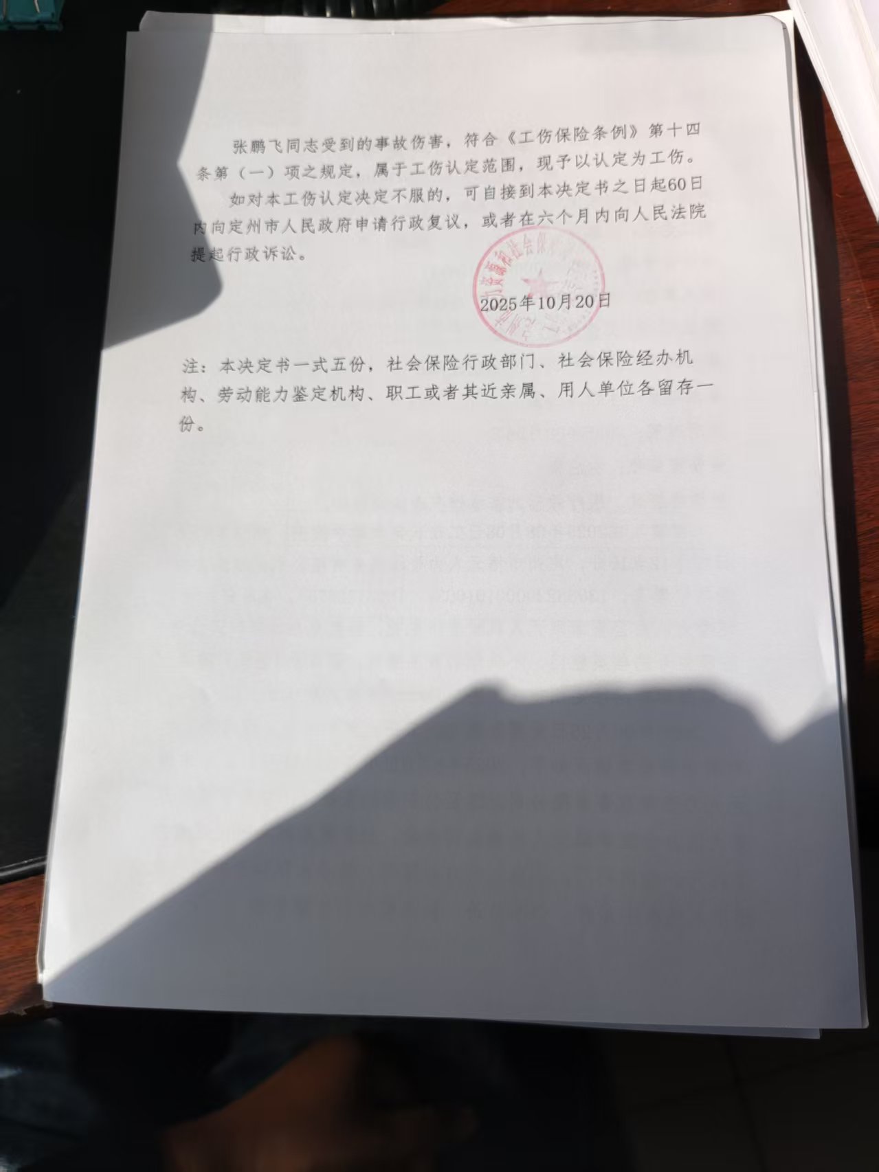 張鵬飛認(rèn)定工傷決定書