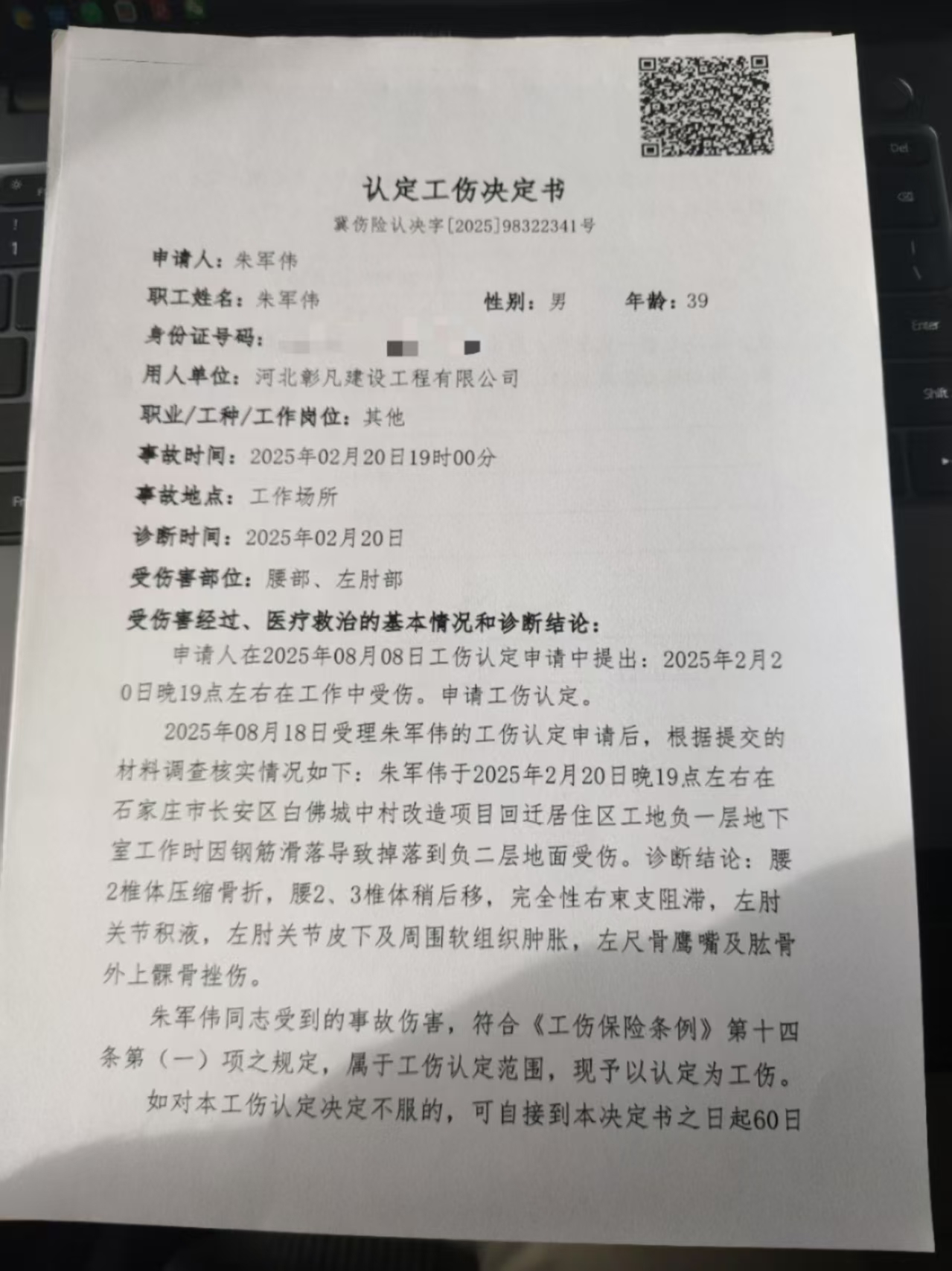 朱軍偉認定工傷決定書