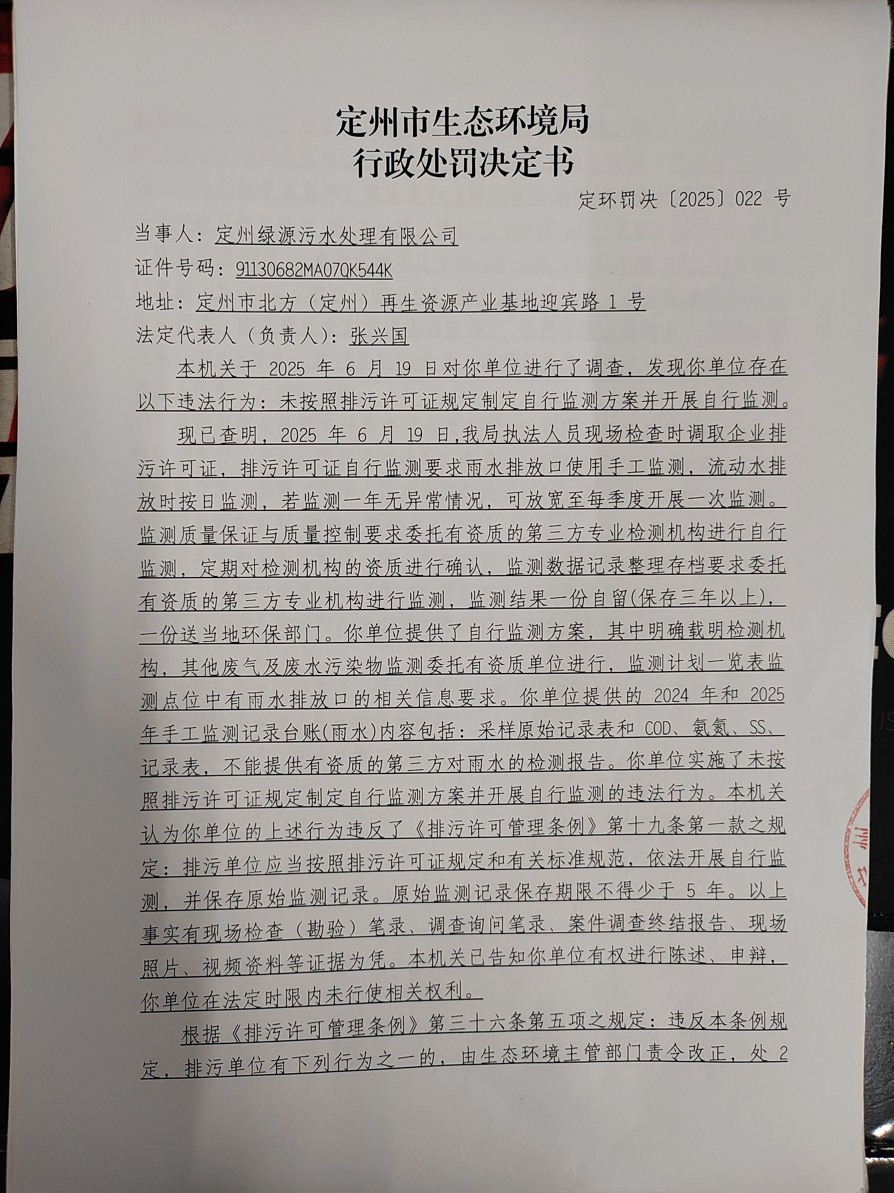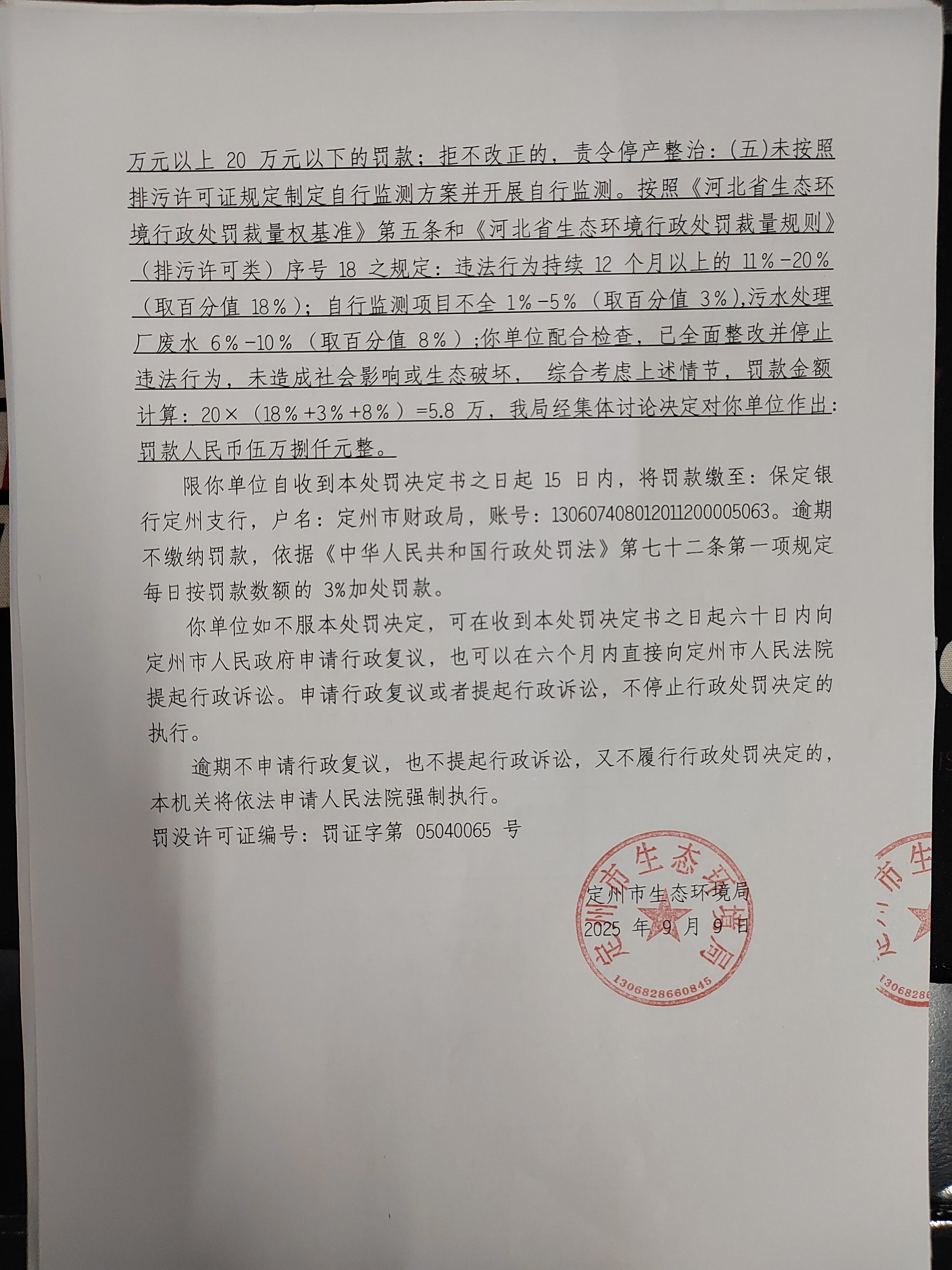定州市生態(tài)環(huán)境局行政處罰決定書 定環(huán)罰決[2025]022號
