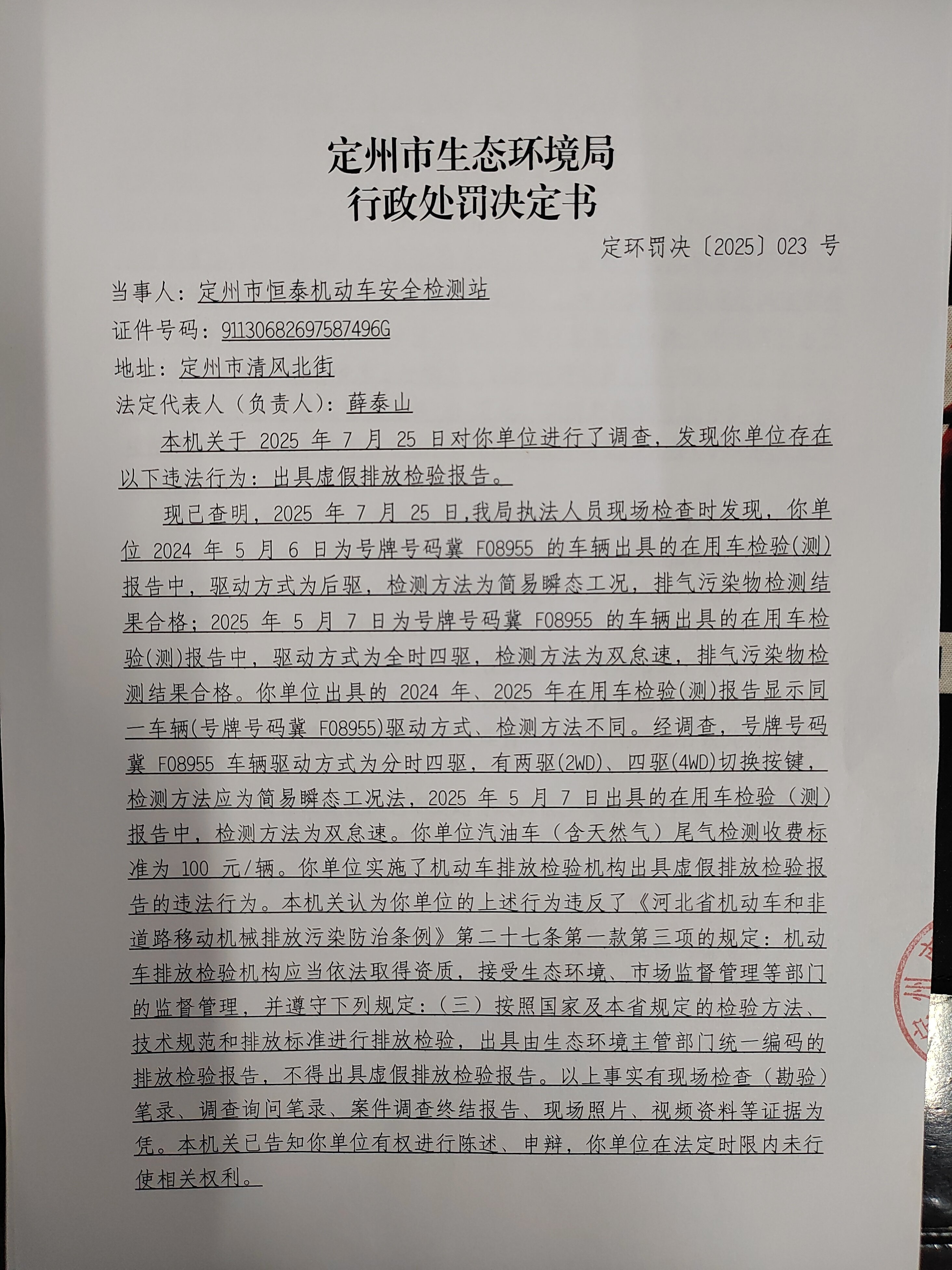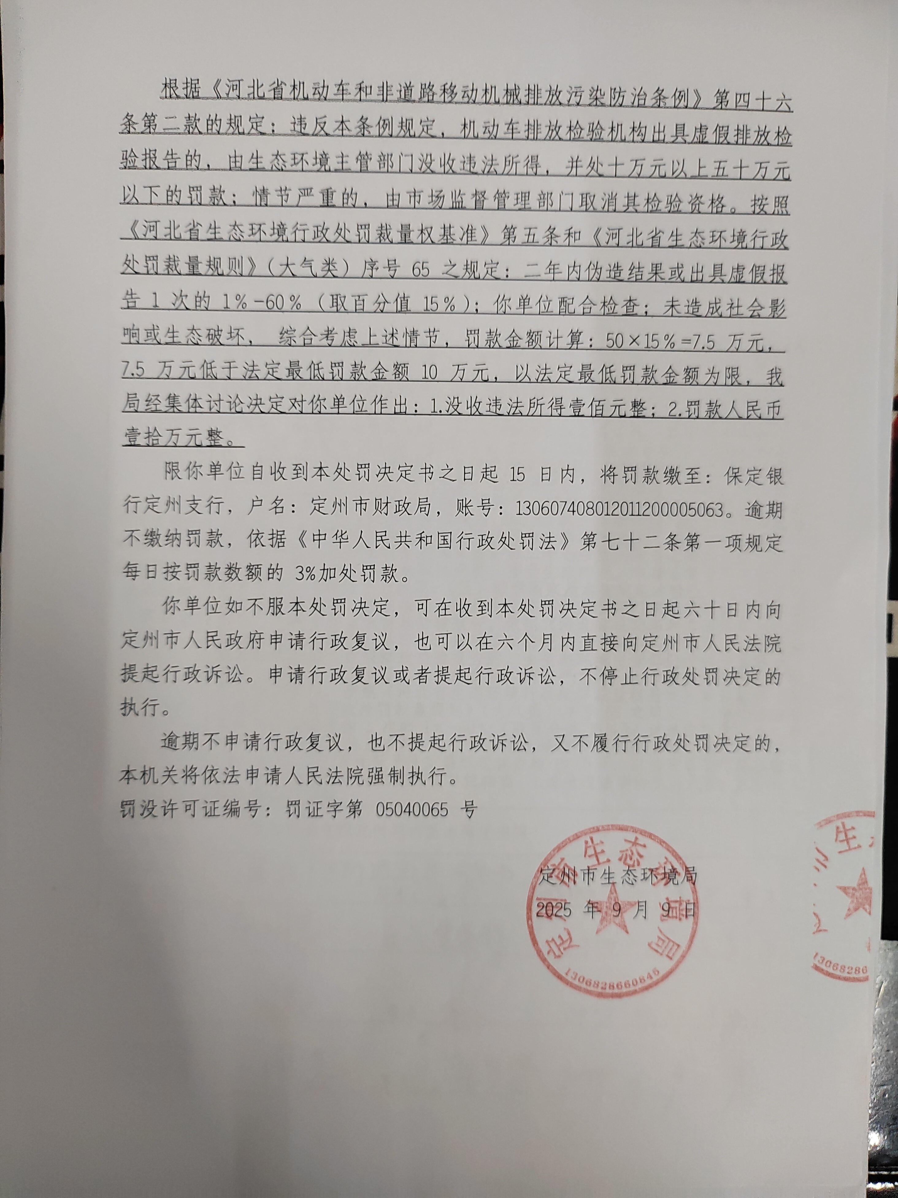 定州市生態(tài)環(huán)境局行政處罰決定書(shū) 定環(huán)罰決[2025]023號(hào)