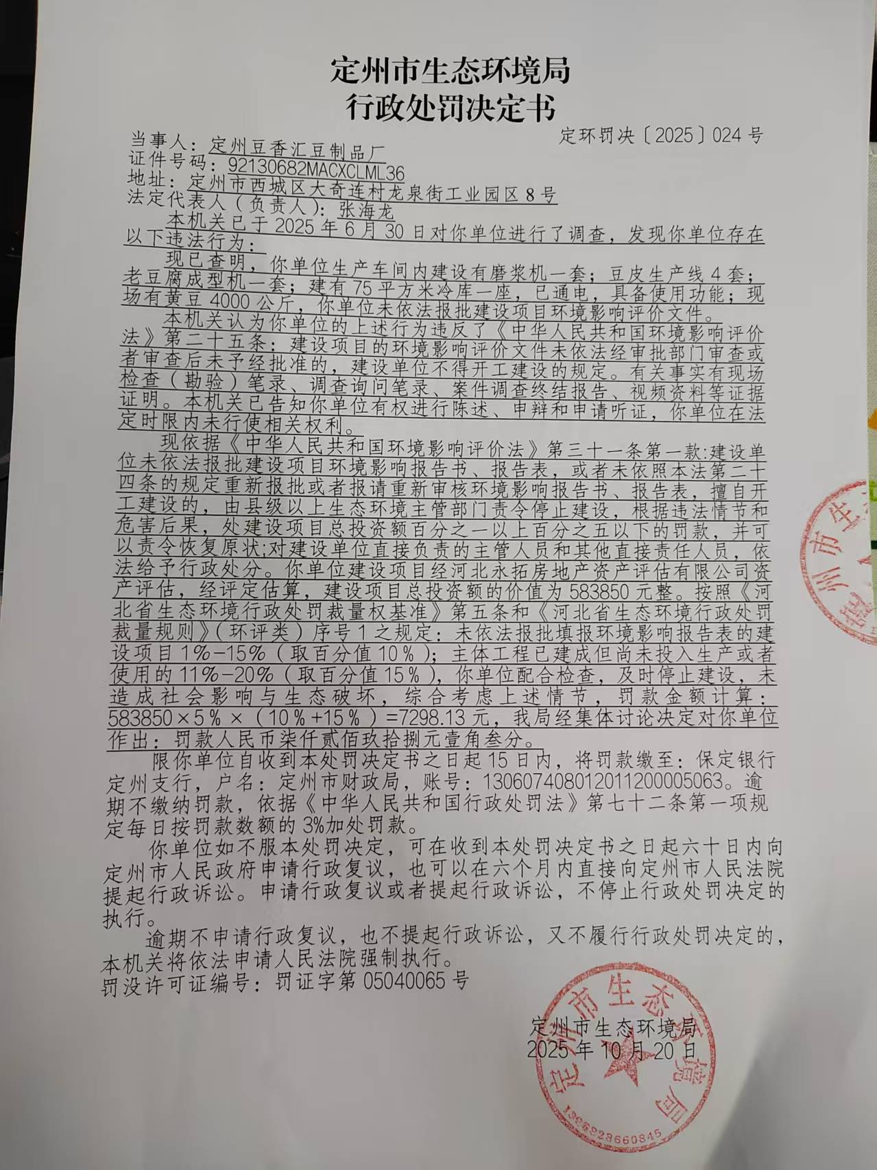 定州市生態(tài)環(huán)境局行政處罰決定書 定環(huán)罰決[2025]024號(hào)