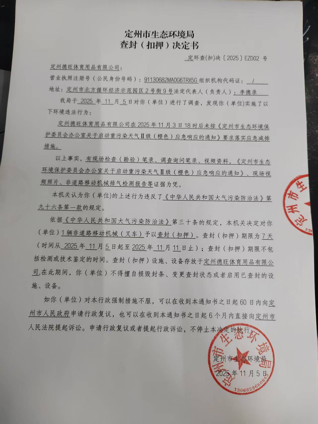 定州市生態(tài)環(huán)境局查封(扣押)決定書 定環(huán)查(扣)決[2025]EZD02號