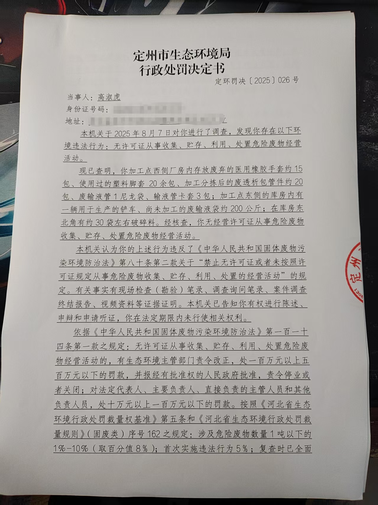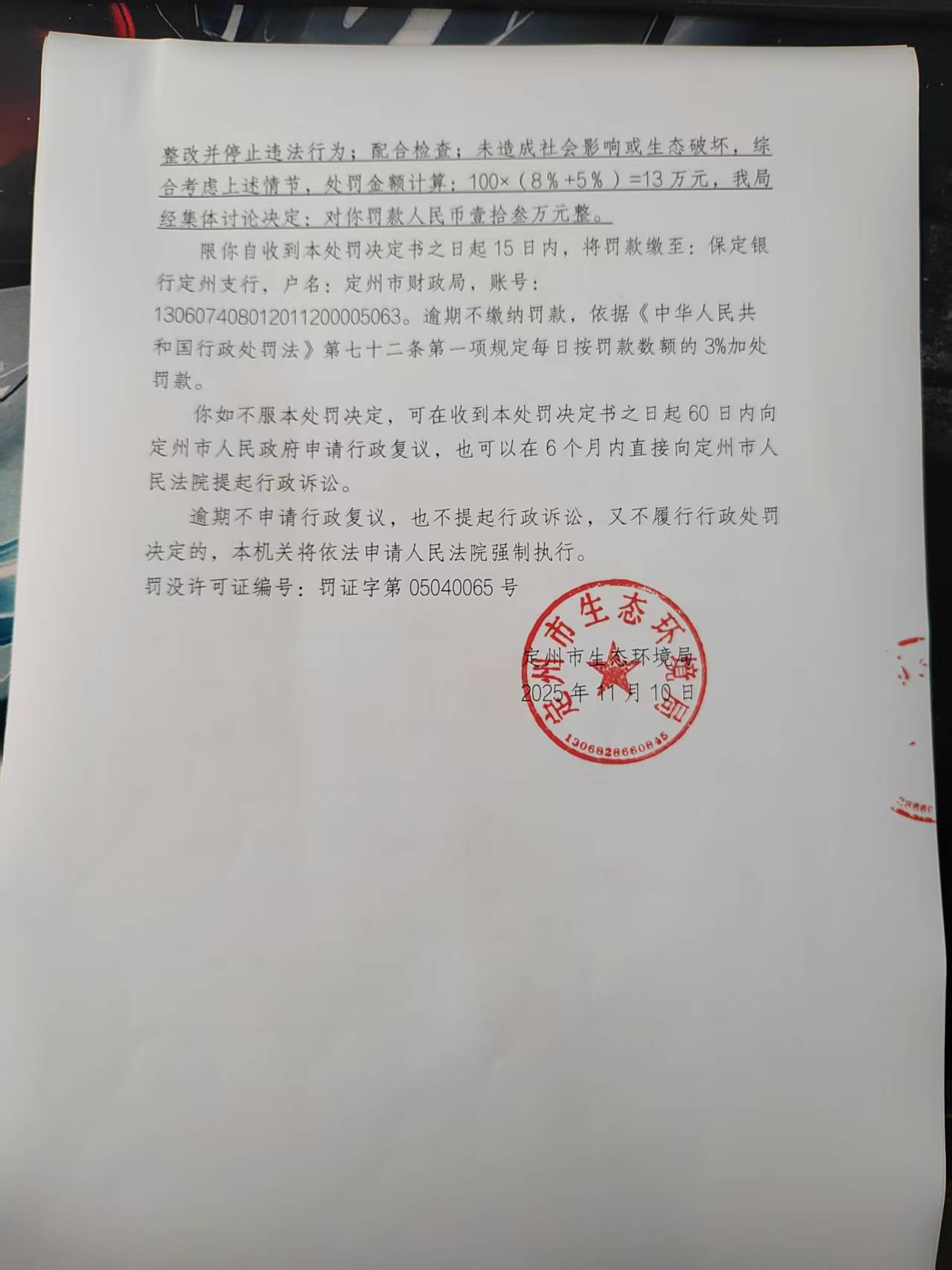 定州市生態(tài)環(huán)境局行政處罰決定書 定環(huán)罰決【2025】026號