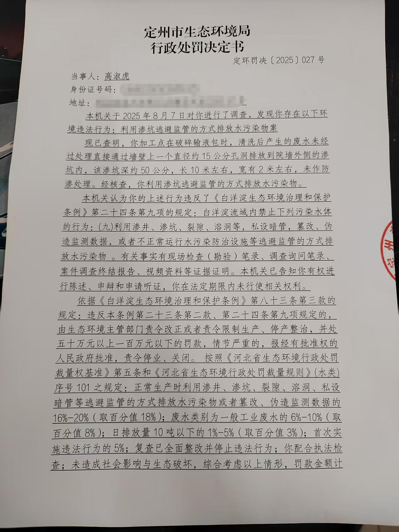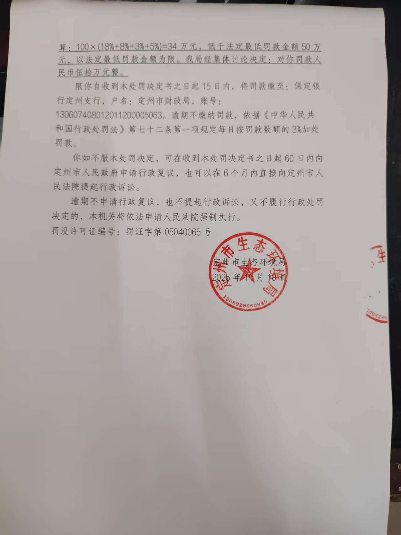 定州市生態(tài)環(huán)境局行政處罰決定書 定環(huán)罰決【2025】027號