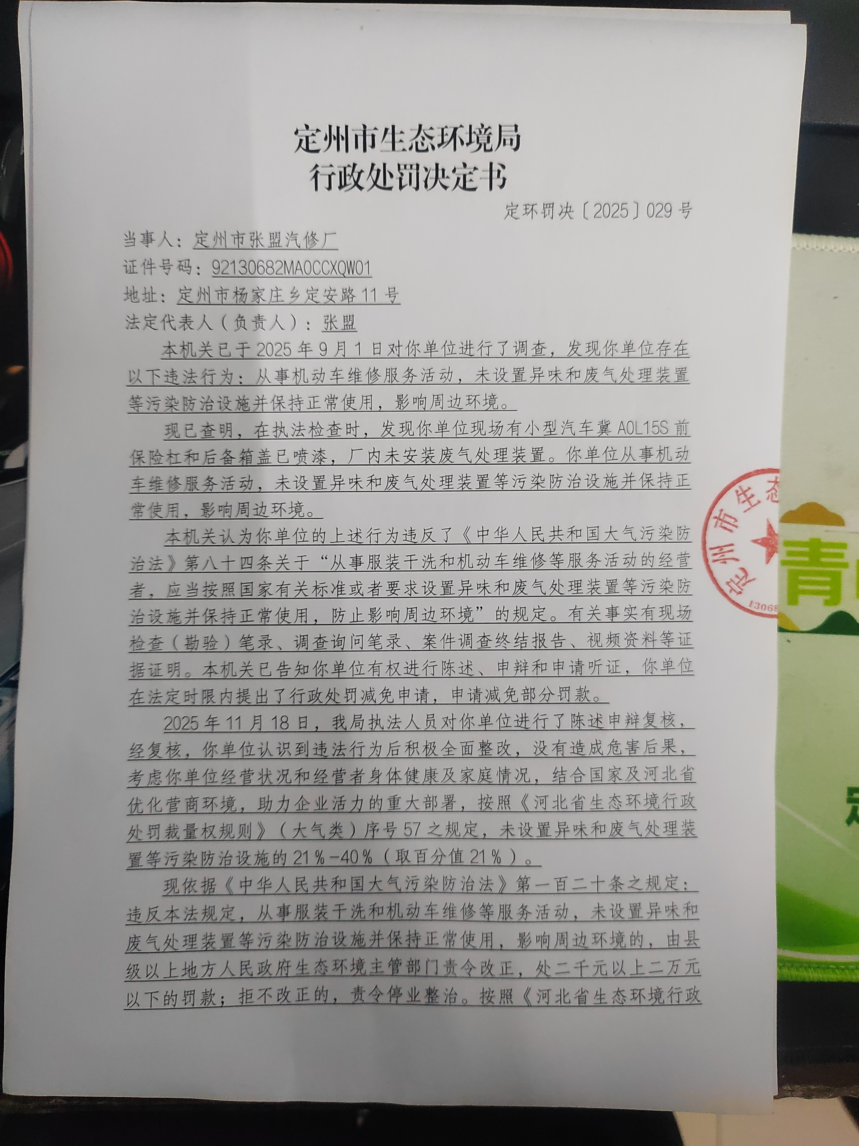 定州市生態(tài)環(huán)境局 行政處罰決定書 定環(huán)罰決【2025】029號