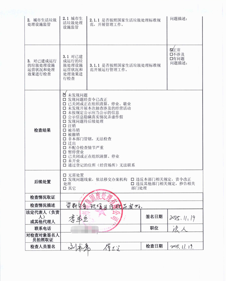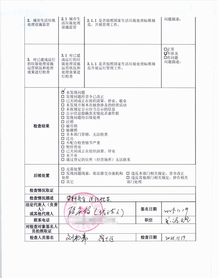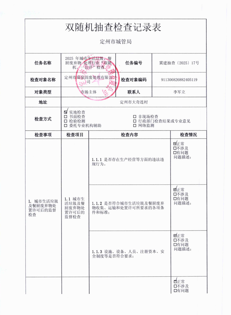 定州市城管局“雙隨機、一公開”林檢查結果(城市生活垃圾及餐廚廢棄物處置許可后的監(jiān)督檢查)
