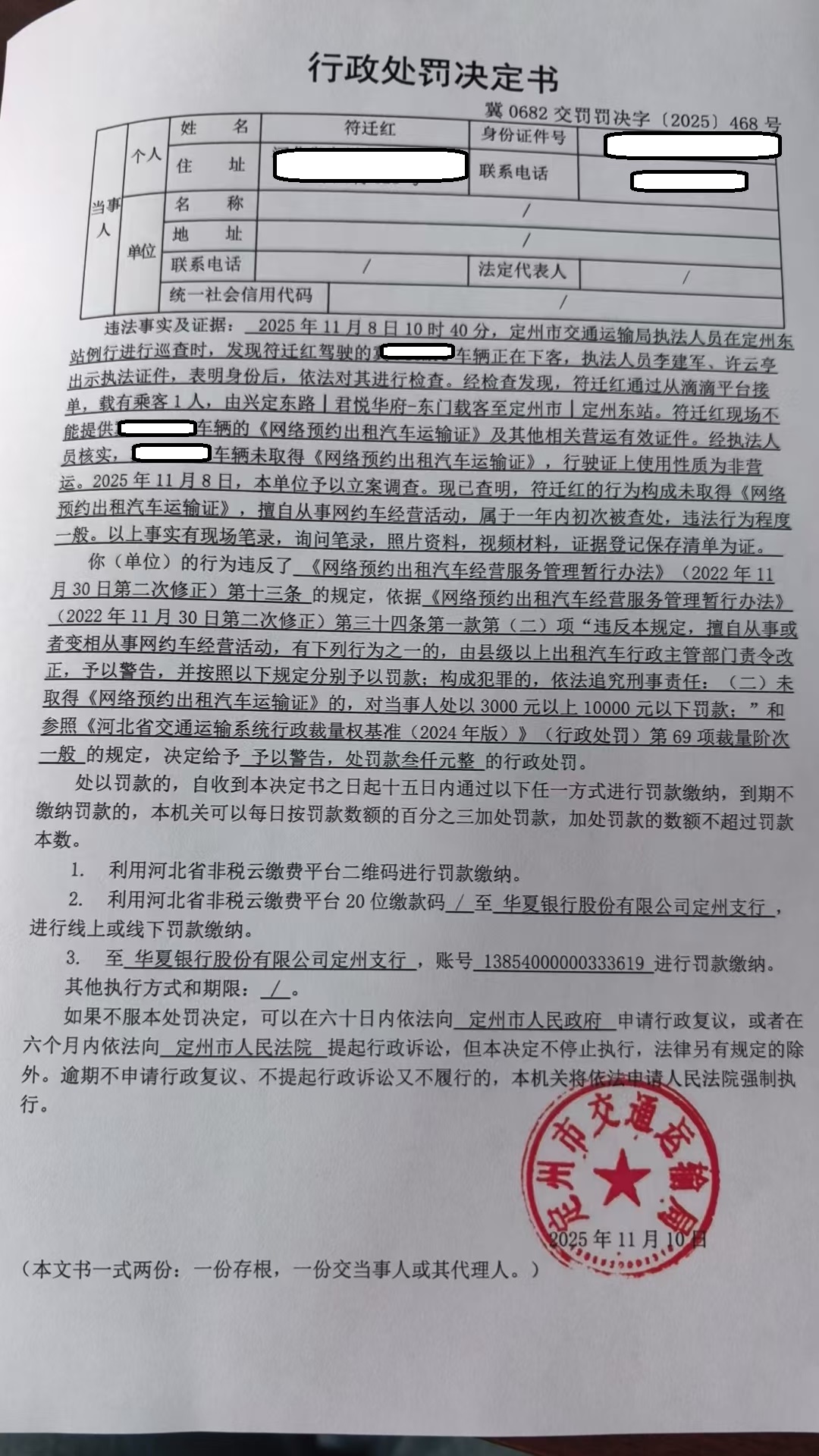 定州市交通運(yùn)輸局行政處罰決定書冀0682交罰罰決字〔2025〕468號