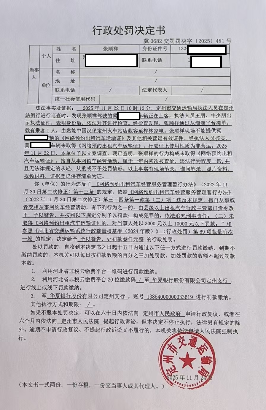 定州市交通運(yùn)輸局行政處罰決定書冀0682交罰罰決字〔2025〕481號(hào)