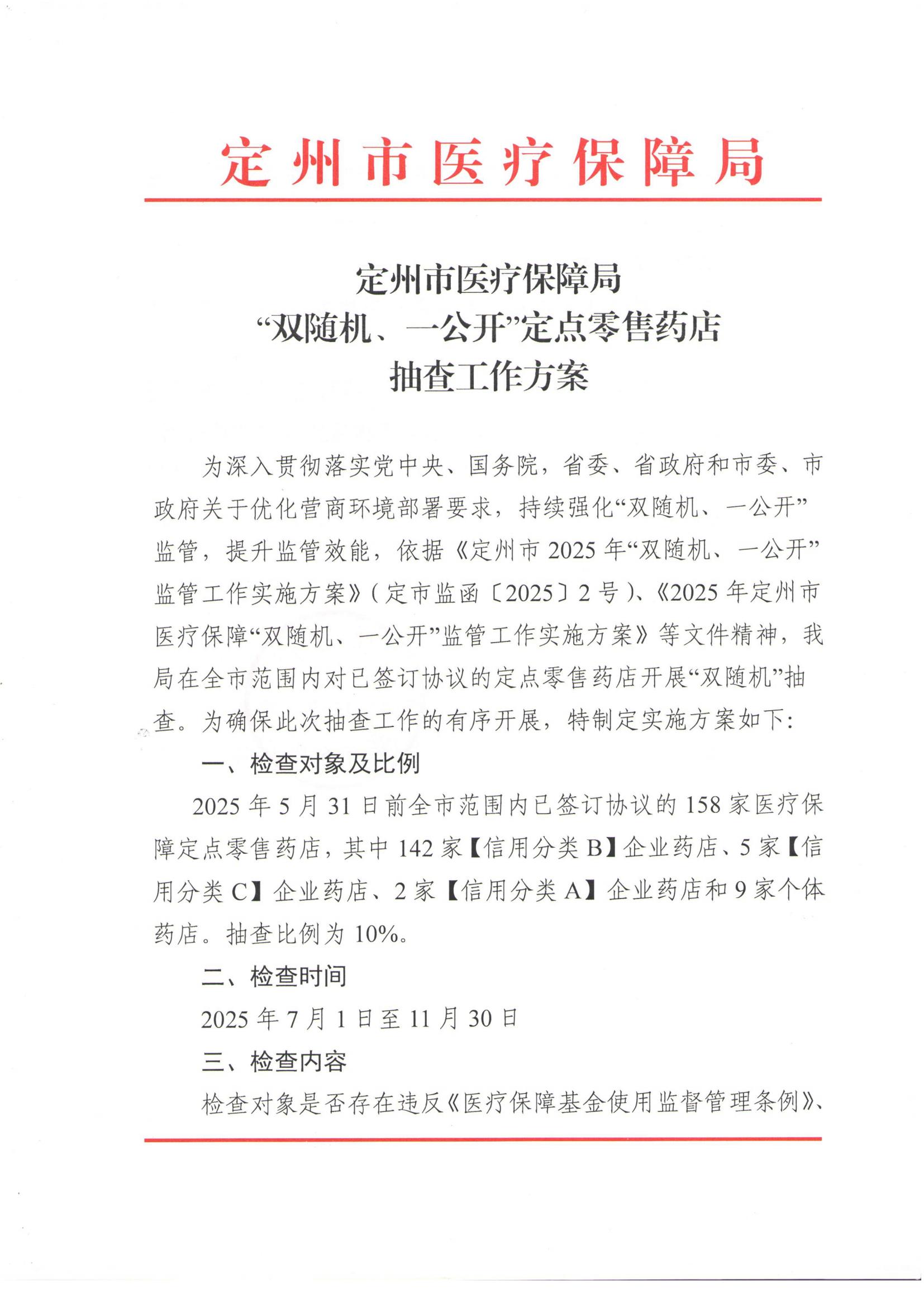 定州市醫(yī)療保障局“雙隨機(jī)、一公開”定點(diǎn)零售藥店抽查工作方案